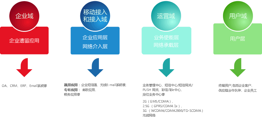 整個框架包括企業域、移動應用和接入域、運營域和用戶域四個部分。其中,企業域主要是企業的各類現有應用,包括郵政、地稅等行業專用系統;移動應用和接入域是企業各類應用向無線方面擴展的域,提供通用應用和專有應用;運營域則是各運營商的網絡部分;用戶域則是用戶的移動終端。