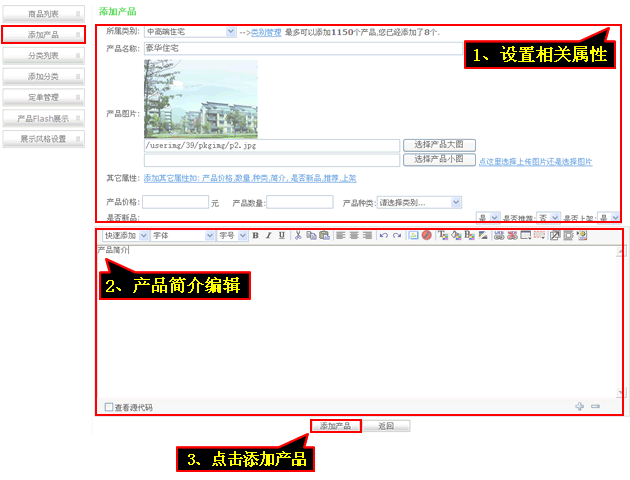 3、添加產品,可以對產品進行“屬性設置”,編輯好“產品簡介”后點擊“添加產品