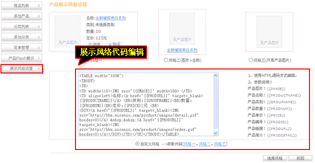 7、產品展示風格可以“自由編輯產品展示風格代碼”,右側有產品的各項參數