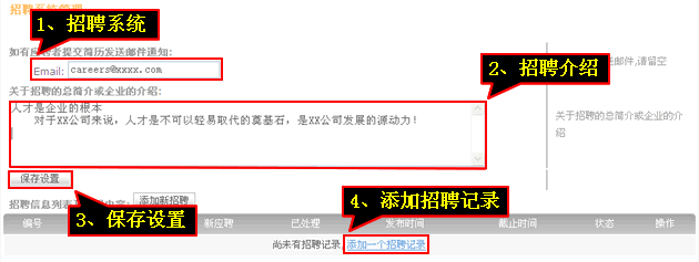 3、輸入“郵箱”、“招聘介紹”,點擊“保存設置”,點擊“添加招聘記錄
