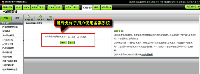 備案系統設置是針對是否允許子用戶使用備案系統設置的. . 默認的狀態是允許的 . 您可以設置為不允許 , 這樣您的子用戶將不能自行提交備案 , 由您代為提交子用戶的備案資料 .