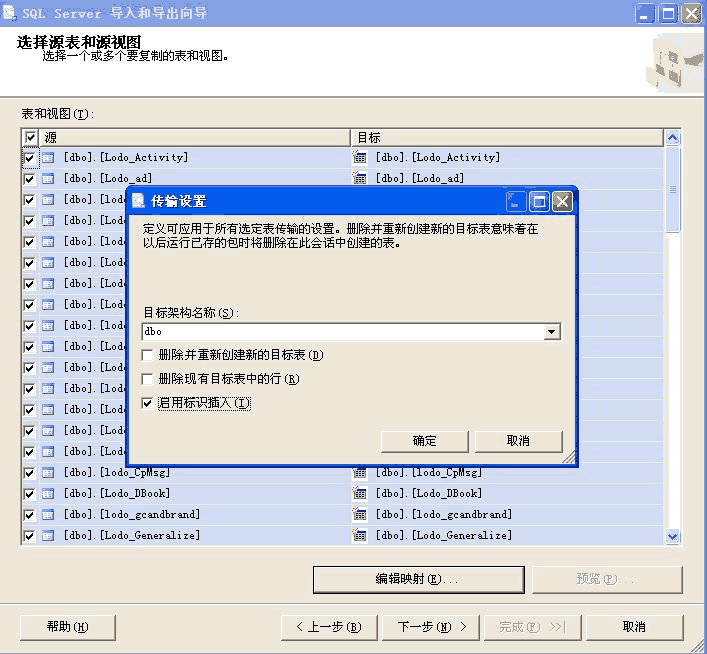 下一步到“選擇源表和源視圖”選擇需要的表后點擊“編輯映射”選中“啟用標(biāo)識插入”(自動增長列插入相關(guān))