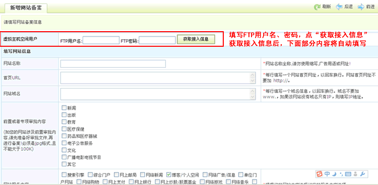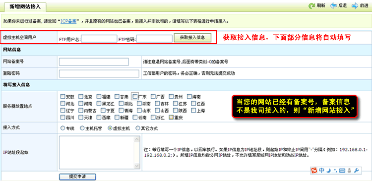 新網站接入:當您的網站已經有備案號,需要用我司空間,備案信息不是我司接入的,則需要進入到“新網站接入